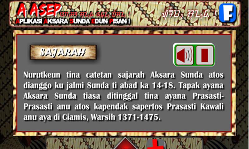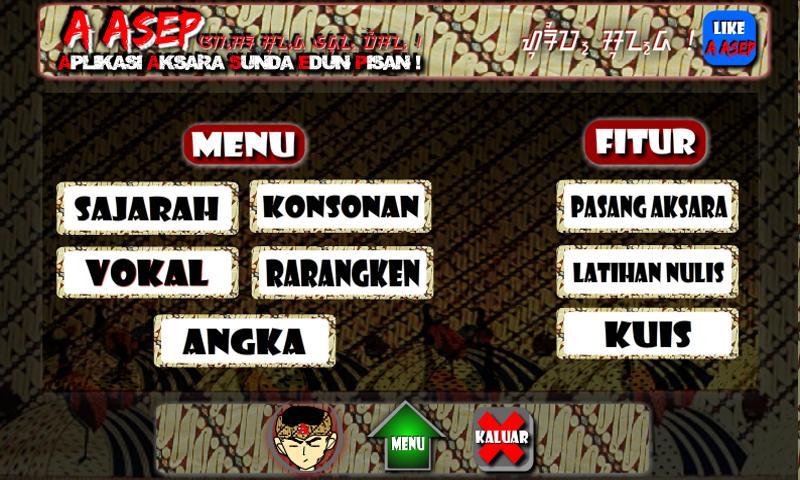 A Asep (Sundanese Literacy Application Edun Pisan) is a Sundanese script introduction application with multi -features interactive to support the learning process of Sundanese script. Equipped with audio, animation, and other interesting features.