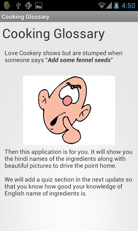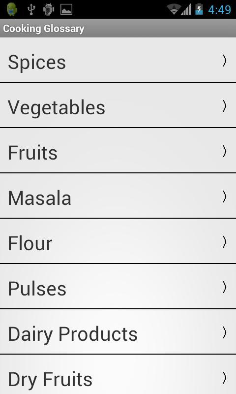 تطبيق بسيط للسماح لك بالتعرف على مكونات الطهي. يتم تجميع المكونات حسب الفئة لسهولة التصفح. يمكنك حتى البحث عن مكون إذا كنت تتذكر جزءًا من الاسم.