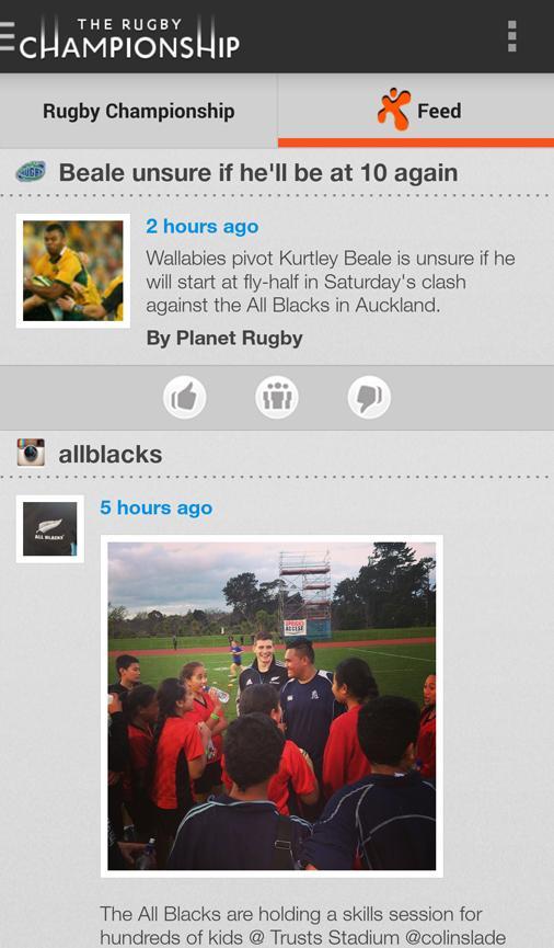 يتضمن التطبيق الأخبار ، والدرجات ، والمدونات ، والصور ، ومحتوى الفيديو والوسائط الاجتماعية ، ويمكنك تخصيص تجربة الرجبي الخاصة بك لإنشاء دفق مخصص يوفر أحدث الأخبار والآراء من صانعي الرأي الذين ترغب في متابعته.