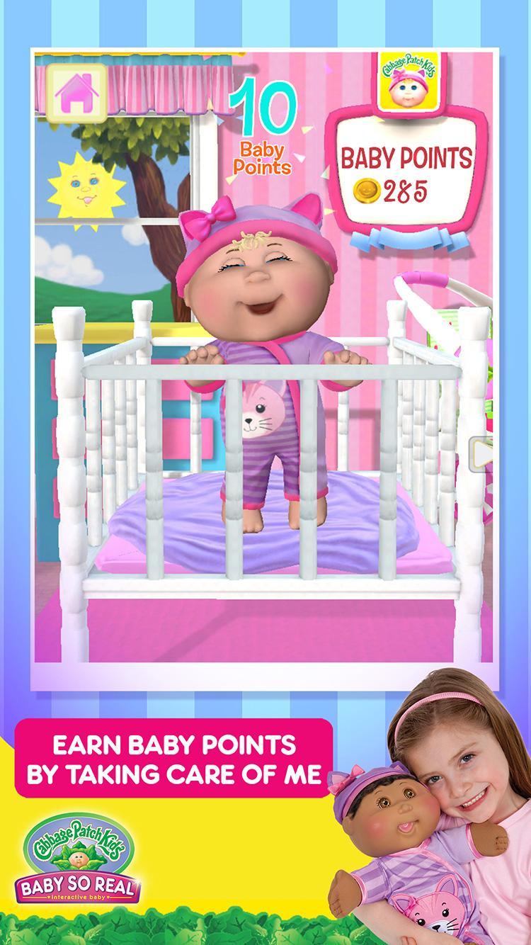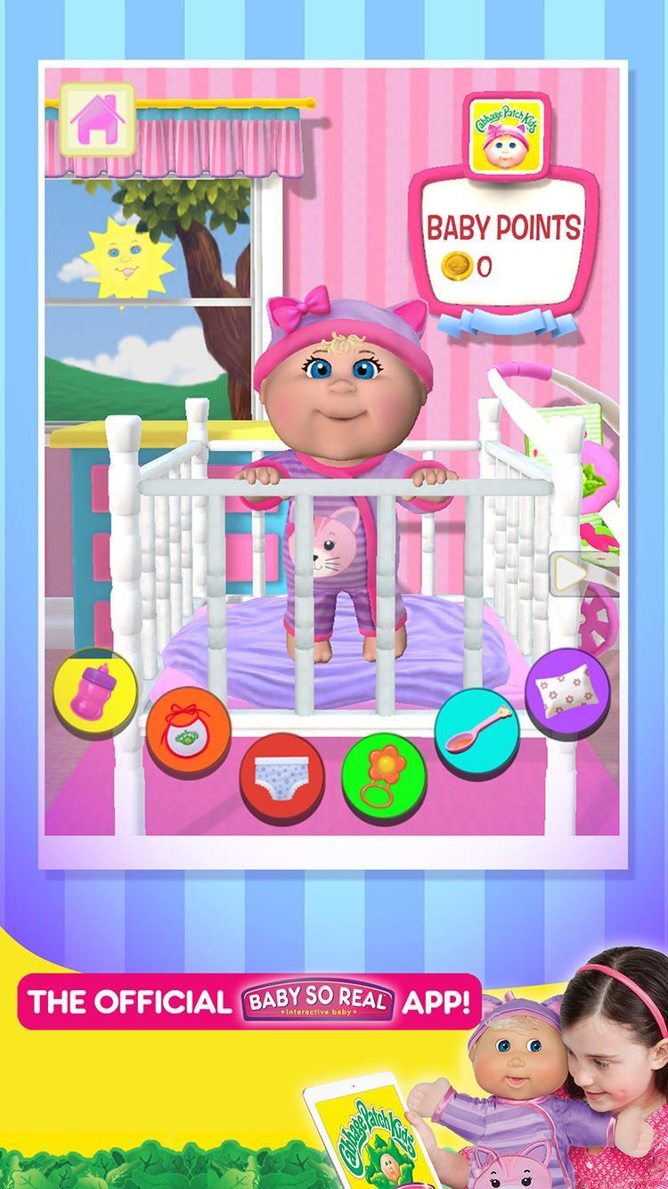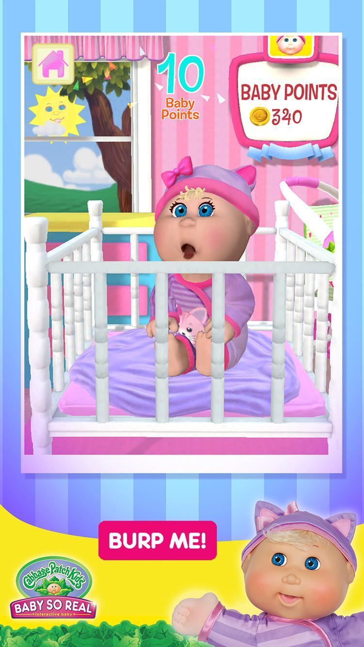 The free Cabbage Patch Kids® Baby So Real™ app acts as a virtual nursery where you can play with your baby, feed her, change her diaper, burp her, and share your love and care. You can also play Cabbage Patch Kids® games, watch video clips and earn Baby Points to get additional virtual accessories, fashions, room décor and more!