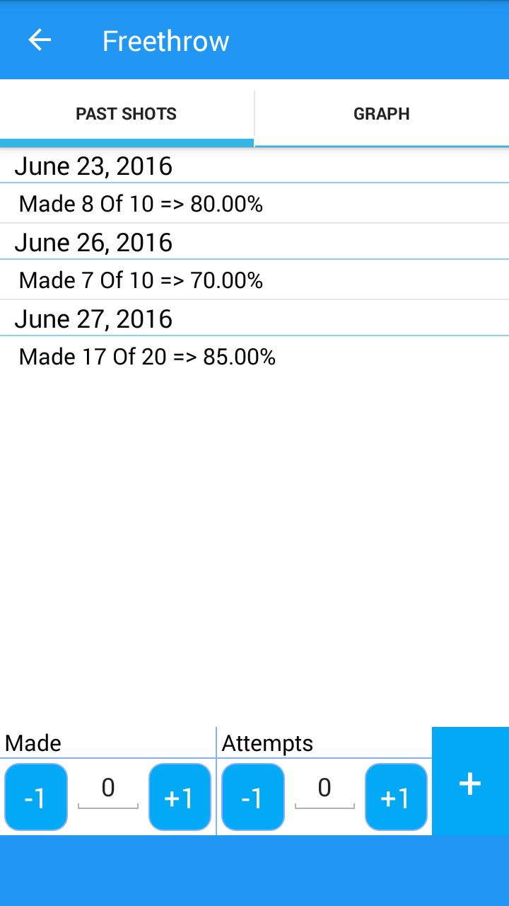 Track your basketball shots from different shot locations. Record your attempts and misses, and use the graph to view progress overtime.