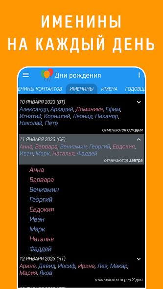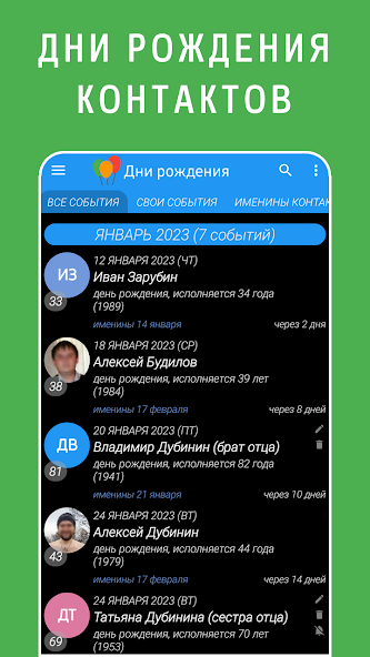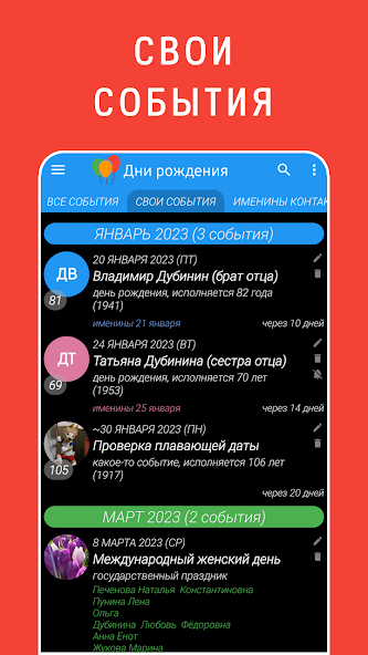 In order not to forget to congratulate friends and relatives, the application has customizable notifications and desktop widgets.