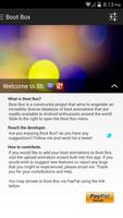 Please consider emailing me before leaving a negative review, Boot Box is a work in progress and is only currently available to showcase an idea, enrichment via the addition of animations will occur slowly as contributions are submitted. Don't forget that the features of Boot Box are free to use!