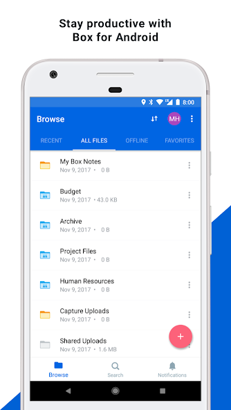 * Upload PDFs, Microsoft Office files, photos, videos and other files to Box