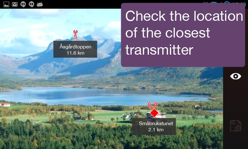 This app makes it easy to check if you have coverage for 5G broadband or satellite broadband from breiband.no. See transmitters throughout Norway from an overview map, or Augmented Reality.