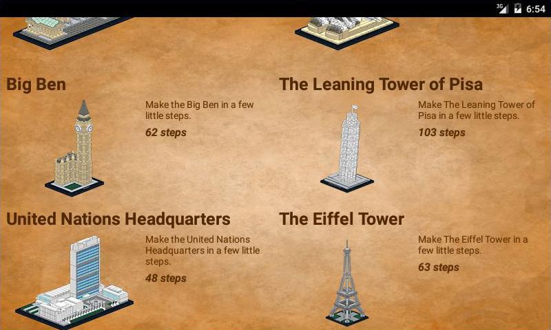 Step-by-step instructions to build famous architectural buildings with bricks.