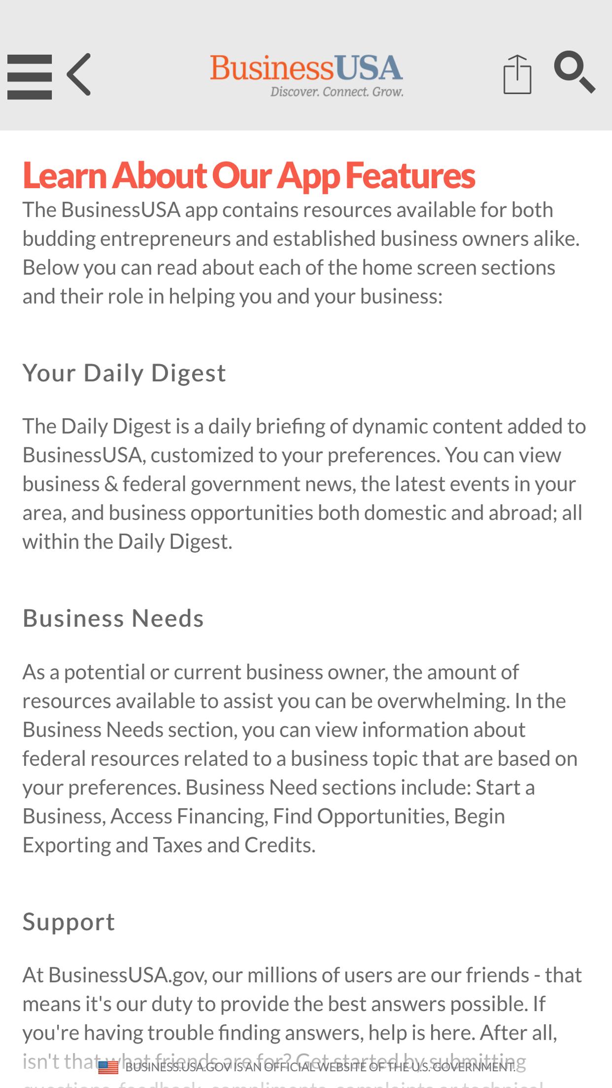 -- Additional functionality will be added to this first version of the BusinessUSA mobile app to give existing and new business owners new tools to start, expand and grow their business! Stay tuned!