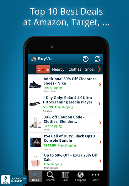 The app delivers more than 100,000 coupons from businesses nationwide. From fast food coupons to shopping promo deals, BuyVia combines in-store and online discount coupons, price comparison, clearance sales, and shopping lists to deliver extreme promos and rewards for shopping at your favorite stores.