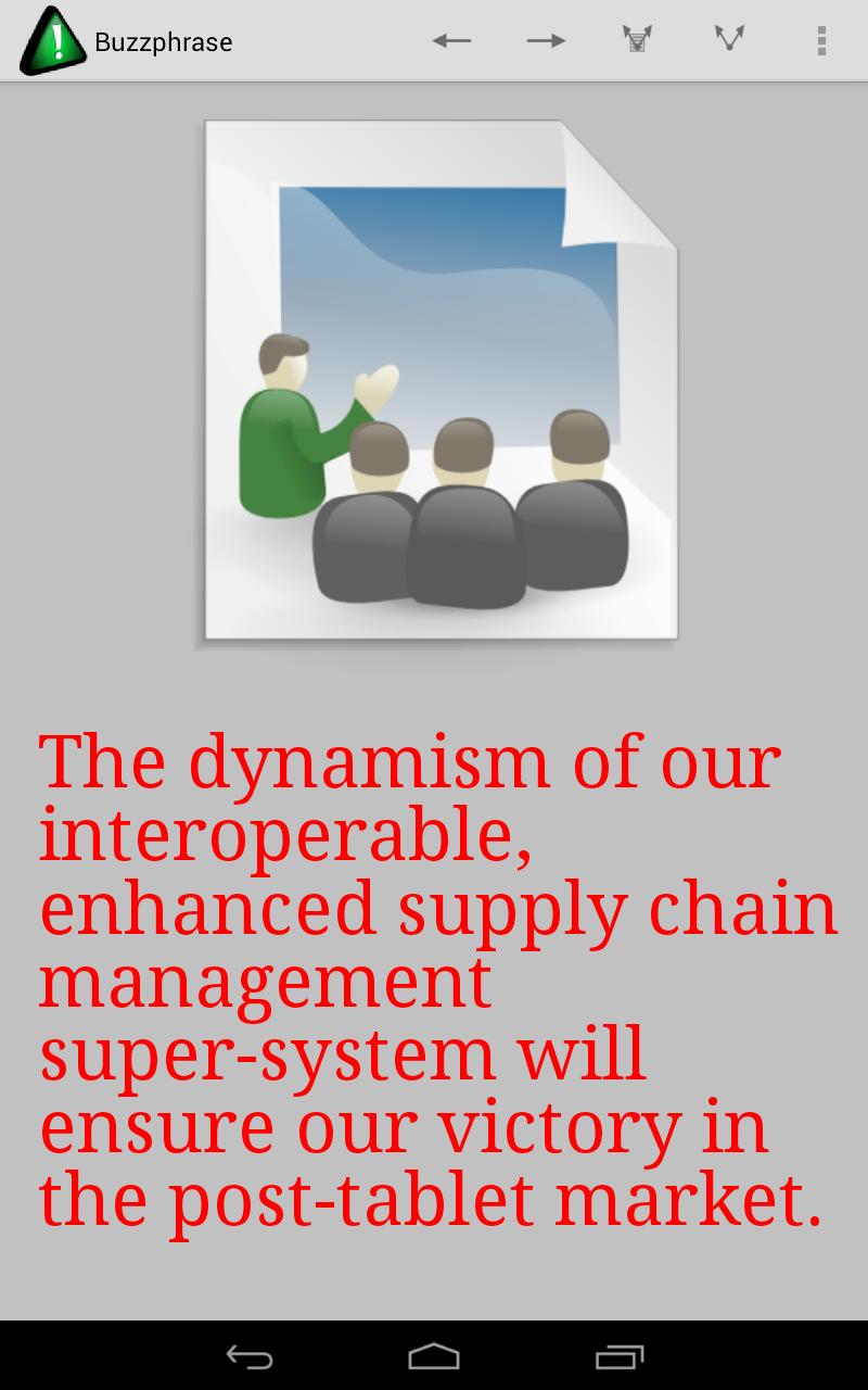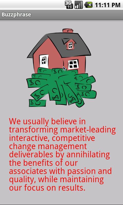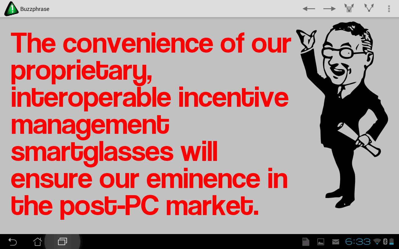 Corporate babble generator. Not some little wimpy thing that just generates 6-word phrases; Buzzphrase advances the state of the art in babbling, with a grammar-driven engine that produces a rich variety of random business drivel, accompanied by more or less suitable clip art. It also allows you to share the generated babble, or copy the text to the clipboard. Combines a mission statement generator and a random policy generator.