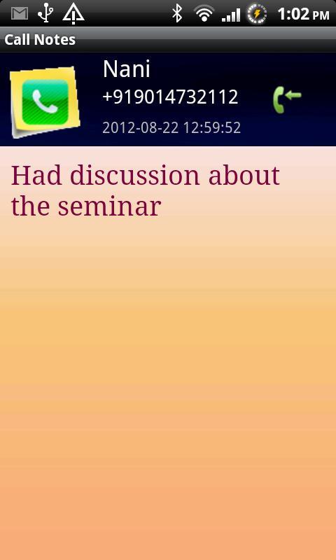 Call Notes application allows you to summarize your phone call conversations. After each phone call (incoming/outgoing), you can add notes/summary to your conversation. You can always manage your notes through the app user interface.