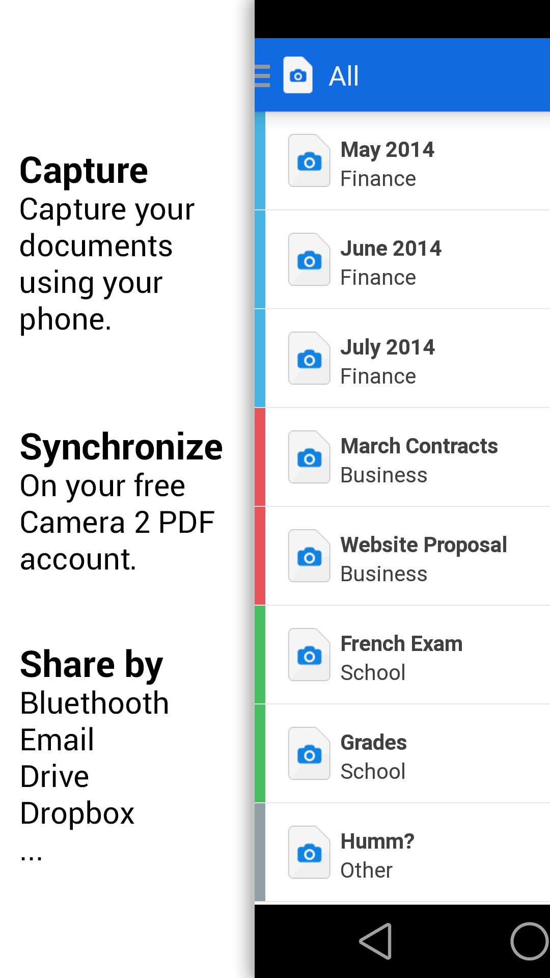 Simply capture your documents with your device's camera, convert them into PDF files and share them wherever you want or synchronize them on your Camera 2 PDF account (visit camera2pdf.com to create a free account.)