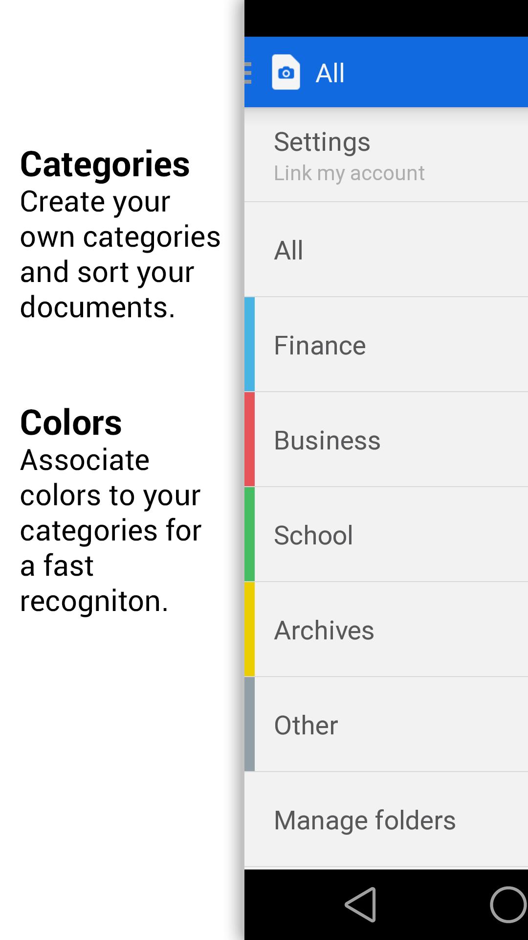 Create your own categories to quickly find back your documents: finance, business, personal, school, meeting, ... no limits.