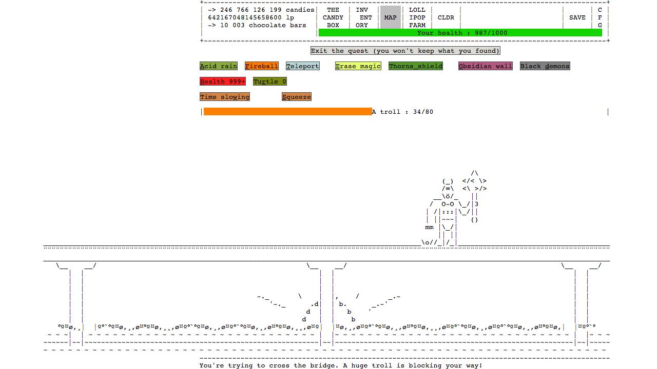 The game revolves around candies, which players receive at a rate of one per second. Gameplay appears very sparse initially, but options appear as the player performs actions.For example, candy can be eaten or used to purchase items.Players can also undertake quests and kill monsters in order to gain candy. By performing quests, the player obtains items which can be accessed in their inventory.