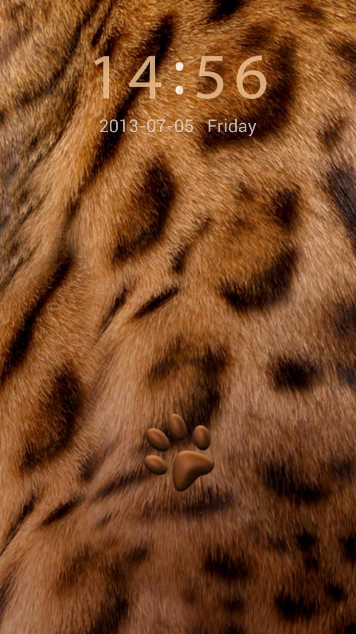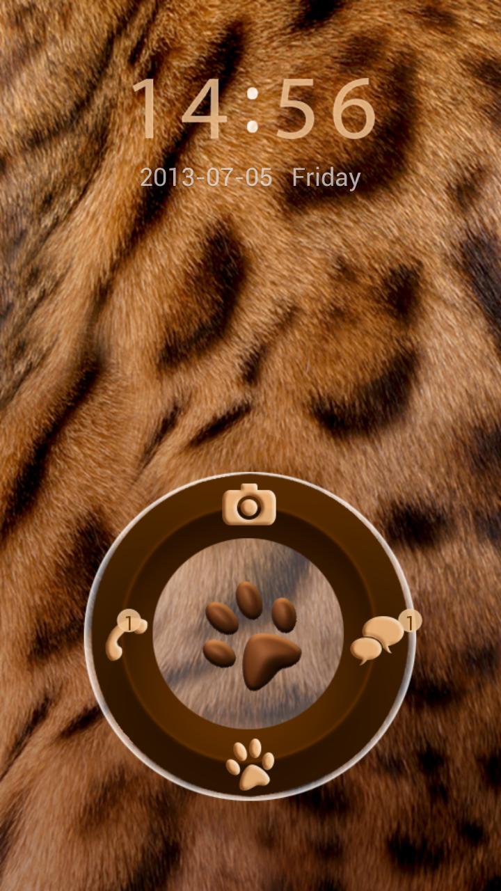 Leopard fur theme. This motif was made for people who like nature and animals, especially these wild from Africa. Color of the clock is brown, date is white. Lock bar has been replaced by wheel with the brown icons of basic application. In the middle of wheel is brown leopard footprint. This wheel is in shades of brown. This application was made in modern colors and patterns so if you want to be trendy or if you just like animals this theme is for you.