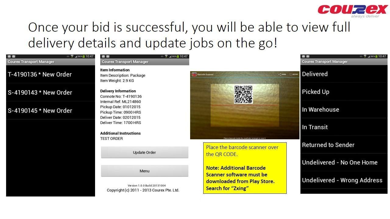 Just download and wait for delivery jobs coming to you! (PLEASE NOTE: You have to download Zxing barcode scanner to work with this application.)