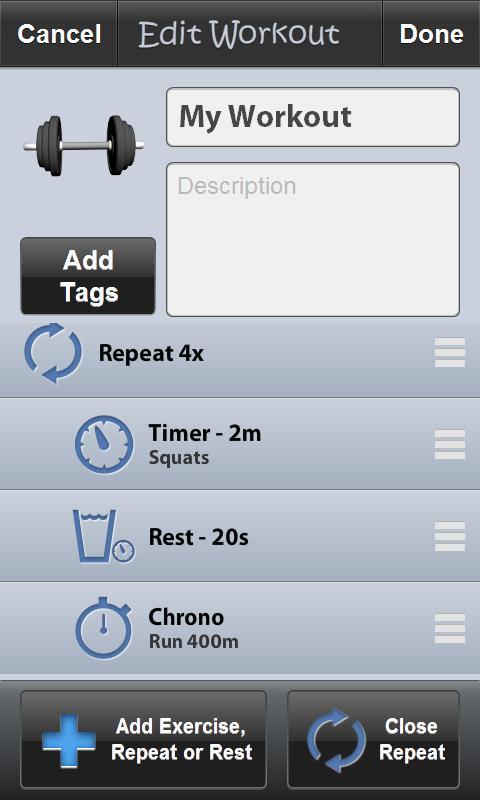 - Flexible workout design - any workout can be created by a clever combination of Timer, Chrono, Logger, Rest & Repeat elements.