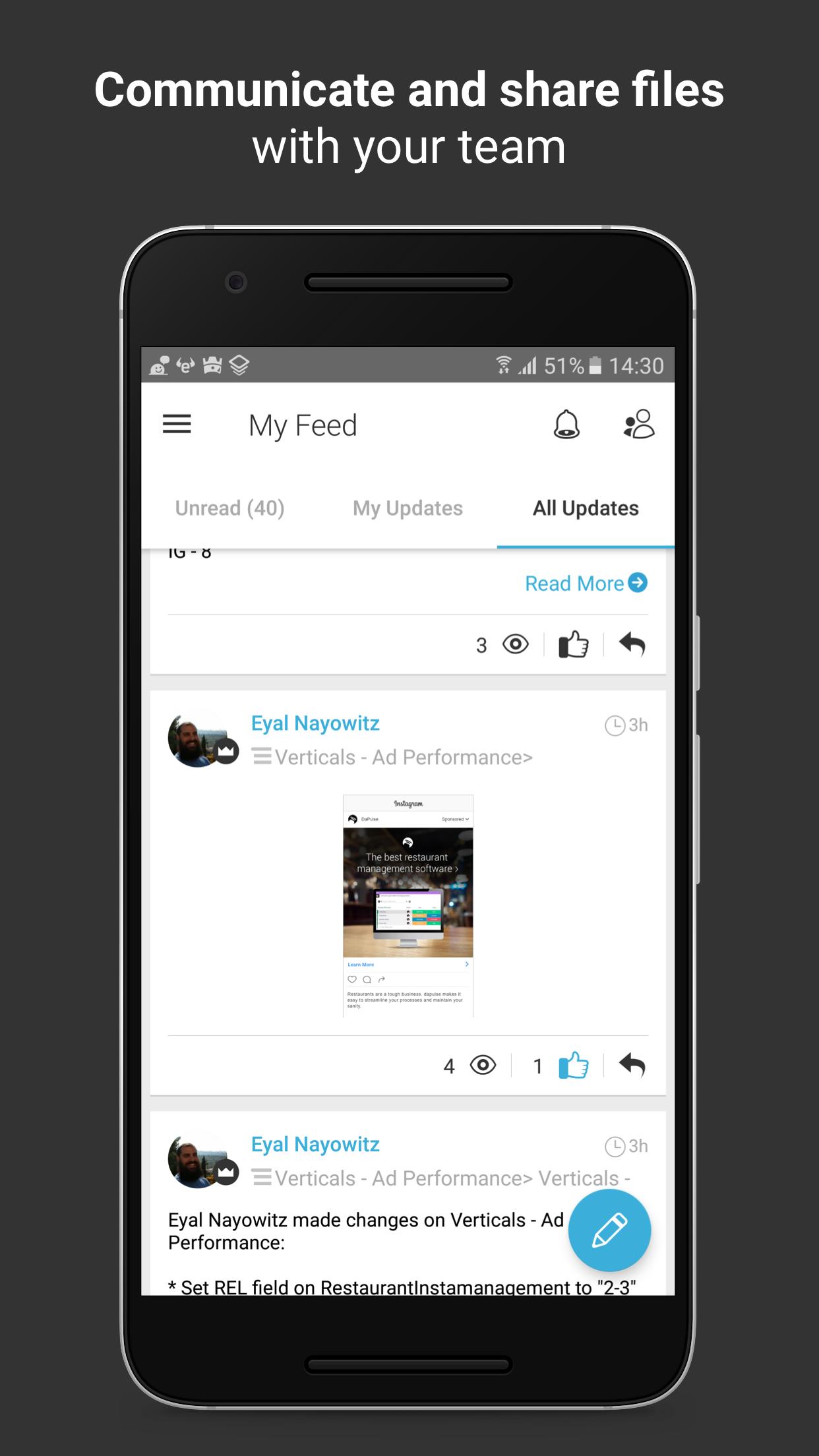 When everyone's clear on their responsibilities, all you need is the freedom to connect and collaborate. In dapulse, you can message your teammates, share files, mention people and teams, and stay updated with real-time notifications. Say goodbye to endless meetings and painfully long email threads.