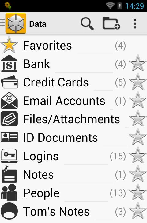 • Categories for logins, passwords, bank data, credit cards, confidential notes and more.