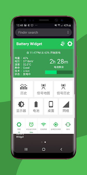 Live -Batteriespiegel -Widget zeigt den Batterieprozentsatz in einem 1x1 -Raum. Die beste Signal -Finder -Karte zeigt, wo Ihre Batteriedrainage aufgrund eines schlechten Signals zunimmt.
