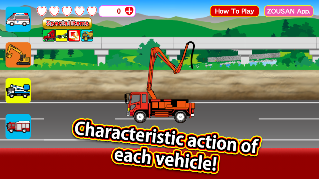 Dies ist eine App, in der Sie spielen können, indem Sie die einzigartigen Bewegungen jedes Arbeitsfahrzeugs ansehen.