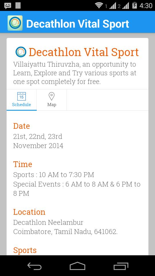 The Decathlon Vital Sport will connect you and keep you updated about all the events which would be happening in Decathlon Neelambur Coimbatore on 21-22-23rd of November. This app will also provide you with the details of the product that have been especially selected by the Decathlon Neelambur team.