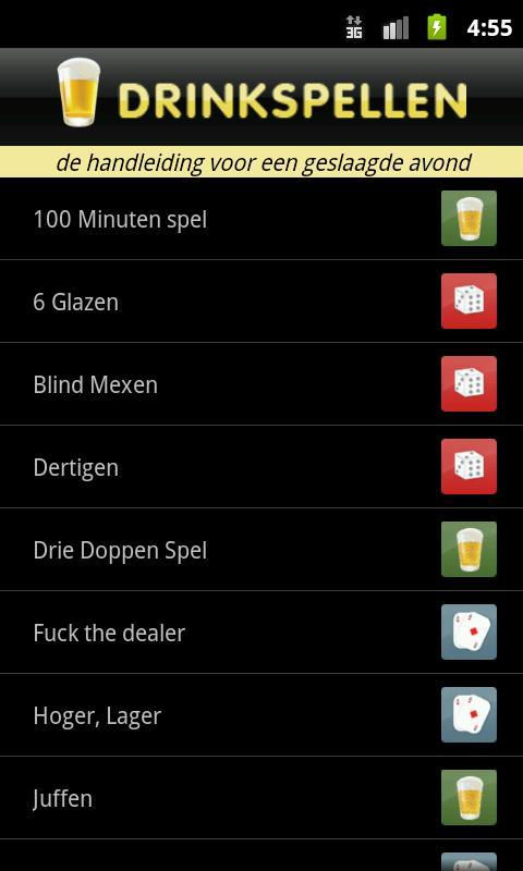 In this app you will find all the well-known drinking games, such as Kingsen, Mexen, Pyramid, Higher Lager, Horse Race, and much more, short and easy explained! Dice games, card games, but also games that requires nothing. Every drink becomes more fun with a good drinking game!