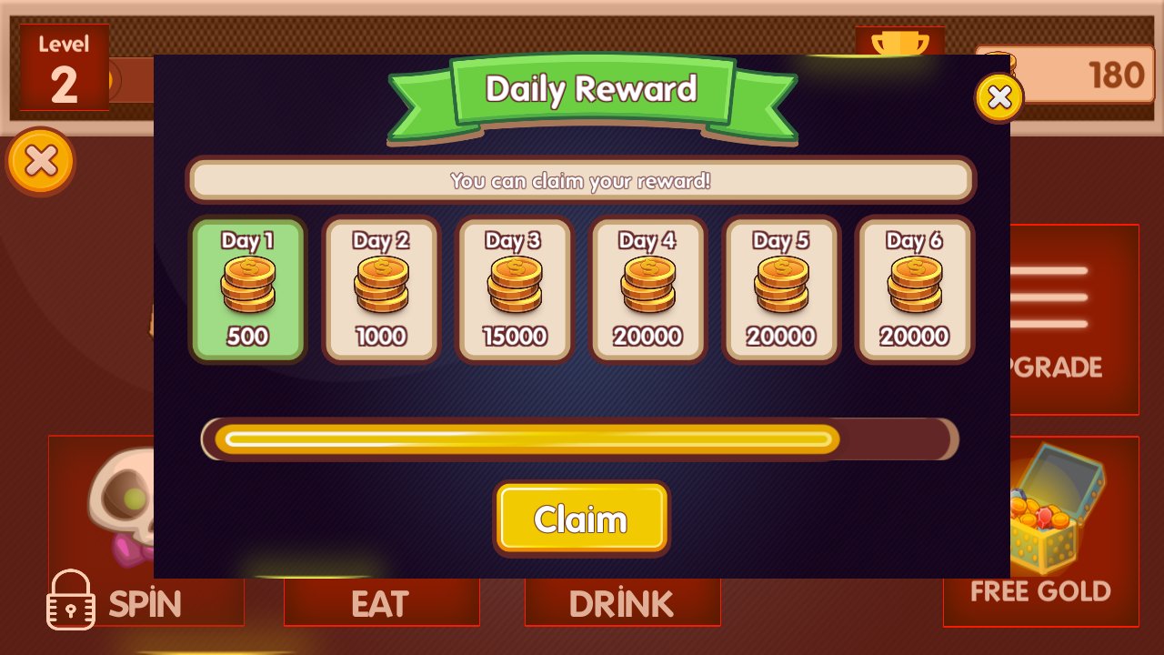 In this game you play a pirate that love to play on the slot machine, to do that you need to upgrade the pirate level, each time you drink and eat the pirate level bar get full, and first then you can play the in-game.