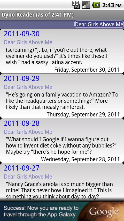 The Dyno Reader for MLIA is the same as the generic Dyno Reader except that the MyLifeIsAverage RSS feed comes pre-selected. When first installed, the application will load the 10 most recent posts and add more as the app runs. By default it will keep looking for additional posts every 15 minutes until the default max of 50 posts. The interval to check for additional posts and the number of posts to keep can be modified within the app by pressing menu and selecting Settings.