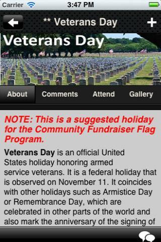 - Galería de eventos de bandera y capacidad para enviar sus propias fotos de eventos de bandera