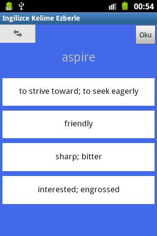 La aplicación no depende de Internet. Es la aplicación Android llamada " Ingilizce Kelime Ezberle " que escribí para memorizar palabras en inglés.