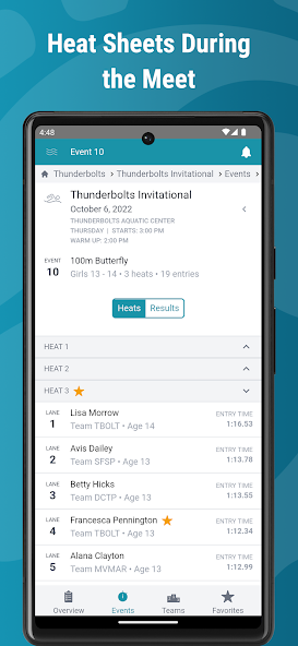 ** Su equipo puede acceder al indicador de SwimTopia Live Event/Heat en la aplicación móvil cuando sus administradores de su equipo realizan algunos simples pasos. Para las instrucciones de administración del equipo sobre el uso del evento en vivo/indicador de calor, consulte: https://www.swimtopia.com/ SwimTopia -live
