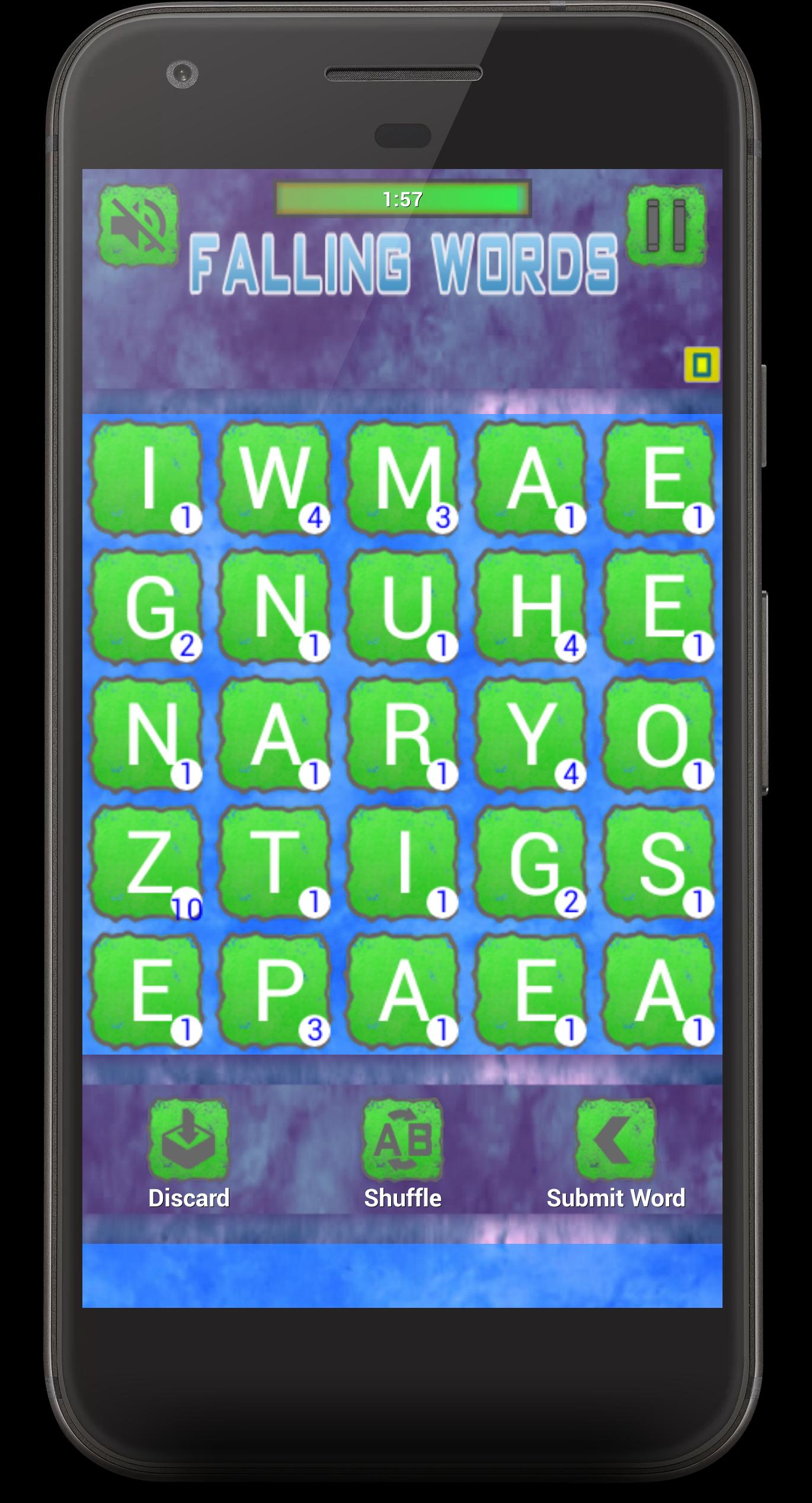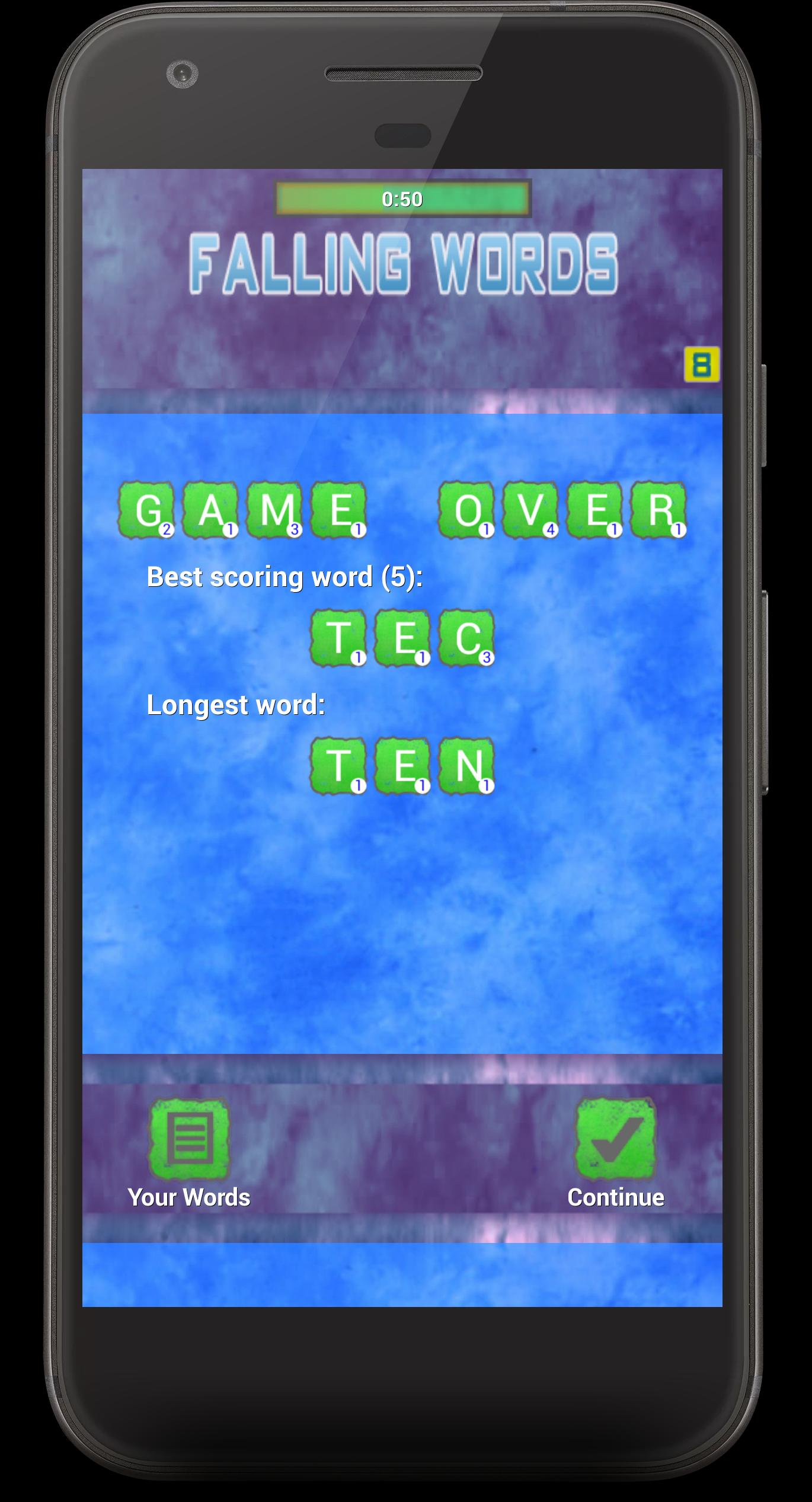 Falling Words is a puzzle game that does not make you bored add up words from letters horizontally, vertically or diagonally, for a certain time you need to add up more words, new words will fall from above.