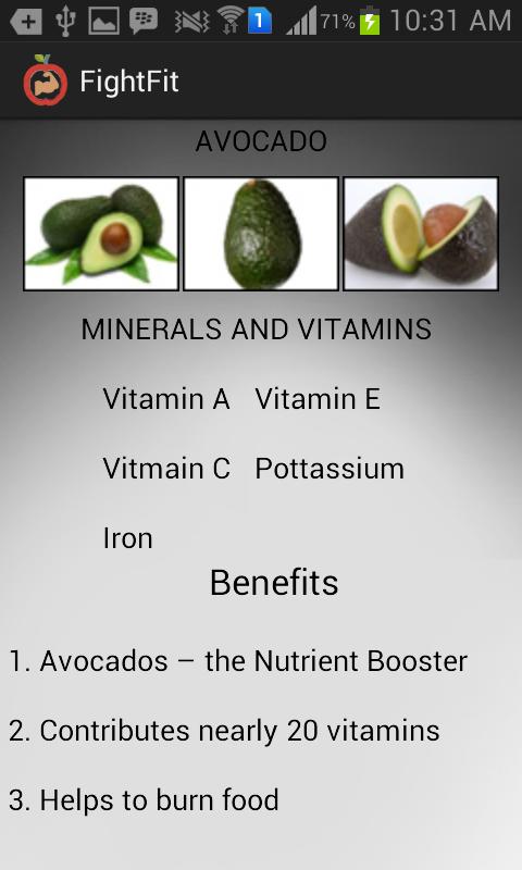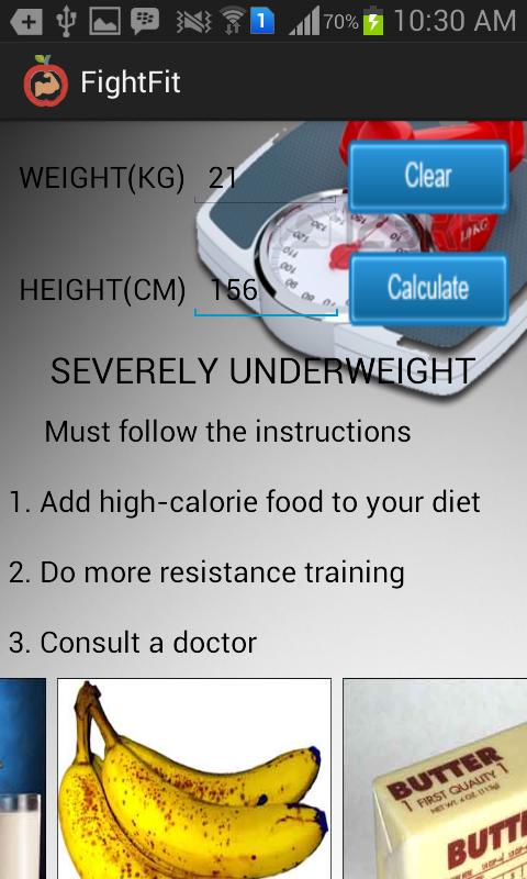 Combing BMI and Diet into a single app. Check you BMI and the app tell you your current fat ratio and the kind of food u need to eat to fight your fitness. The application shows you the benefit of eating each food component.