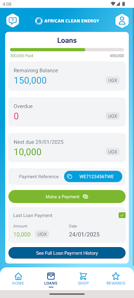 Ici, vous pouvez consulter les détails de votre prêt, y compris le montant du prêt, le solde restant, les derniers détails de paiement et l'historique de paiement du prêt. Si vous êtes un client d'Ouganda avec un compte MTN, vous pouvez également lancer un remboursement de prêt via cette page.