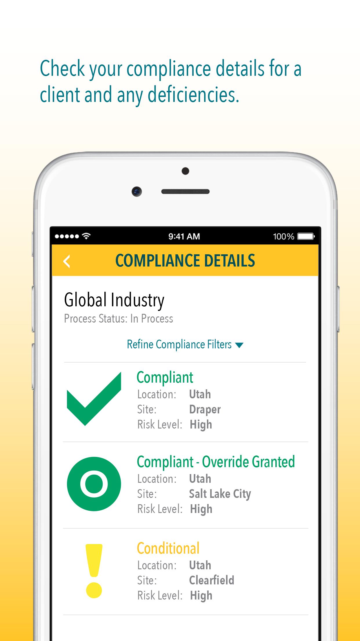 À l'aide de votre téléphone ou de votre tablette, vous pouvez vérifier votre statut de conformité avec chaque client, afficher toutes les lacunes, gérer votre liste d'employés, contacter votre spécialiste de la chaîne d'approvisionnement et bien plus encore.