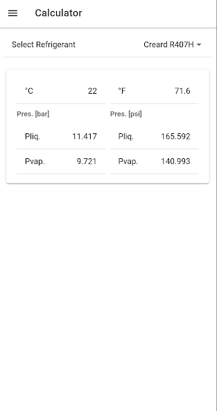 Calculatrice P / T pour la température ° C / ° F et le curseur de données de réfrigérant