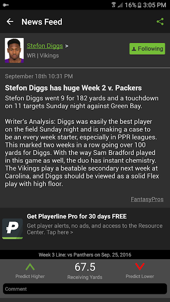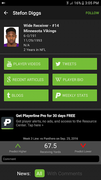 Vous pouvez également faire des prédictions sur les performances des joueurs de la NFL et gravir les rangs en tant qu'expert parmi des milliers d'autres utilisateurs de Playerline. Chaque prédiction établit une «ligne» de joueur, vous avez donc une idée globale de la façon dont des milliers de personnes s'attendent à ce que certains joueurs effectuent cette saison de la NFL.
