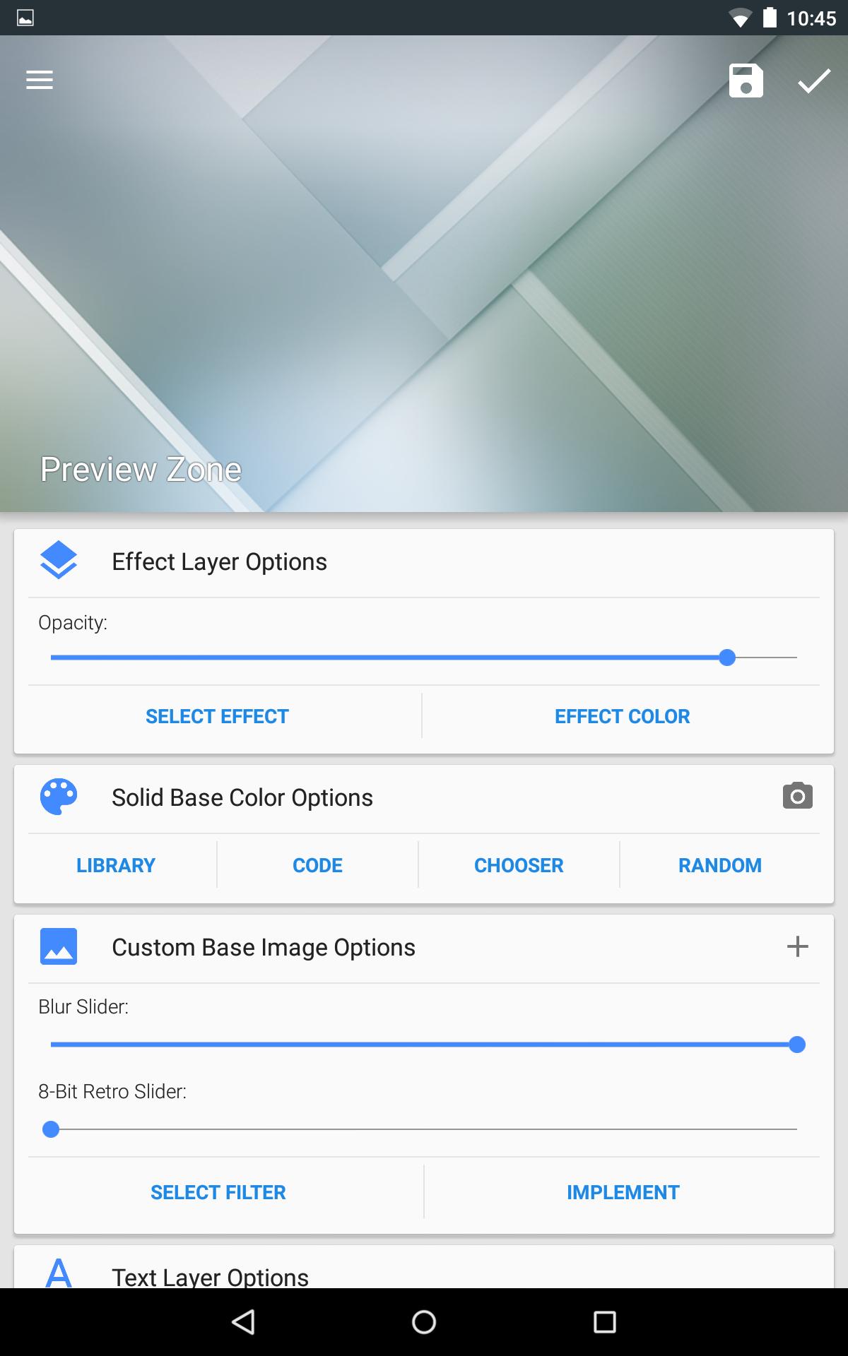 Une fois que vous avez terminé votre création, appuyez simplement sur la coche en haut à droite pour définir l'image en tant que fond, ou appuyez sur le bouton Enregistrer pour enregistrer votre image sur votre carte SD pour une utilisation future ou pour partager avec vos amis.
