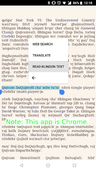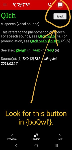 Il s'agit d'un moteur de texte-parole (TTS) pour la langue Klingon ({Tlhingan Hol}) qui peut être utilisé avec {boqwi '} et d'autres applications prises en charge. Il peut être utilisé avec n'importe quel navigateur Web qui prend en charge l'action de sélection de texte. (Chrome prend en charge cela, Firefox ne le fait pas.) Recherchez-le dans les paramètres de texte vocale de votre appareil.