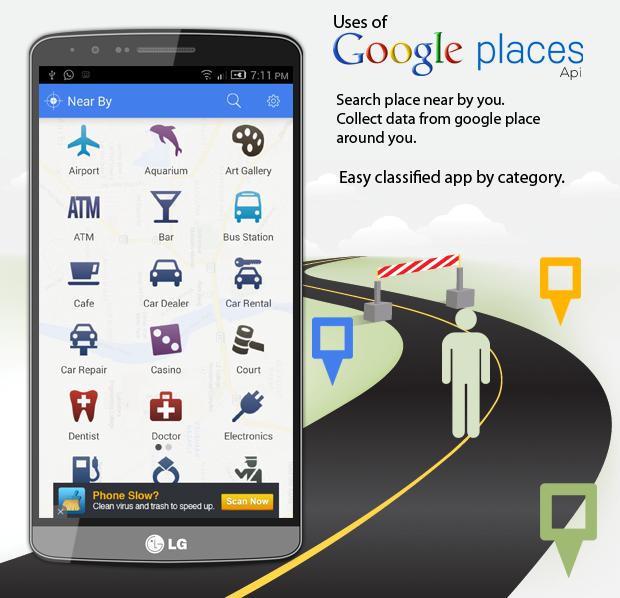 L'API Google Place utilise pour identifier votre application. Nous avons développé une application appelée "Nar by By" Autoriser l'utilisateur à rechercher un lieu près de lui