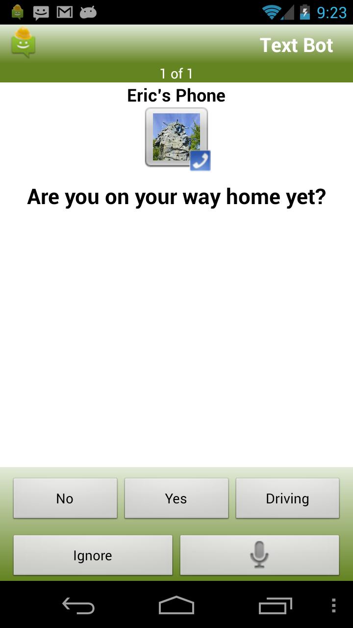 Comment les gens l'utilisent-ils? Ils ont mis leur téléphone dans le quai de leur voiture et dans leur chargeur de voiture. Ils démarrent TextBot et configurent l'option pour que TextBot "lise" les messages entrants à haute voix. Ensuite, ils utilisent leur téléphone comme GPS. Lorsqu'un message entre, TextBot le lit et ils peuvent appuyer sur 1 bouton pour répondre et être retournés à leur application GPS.