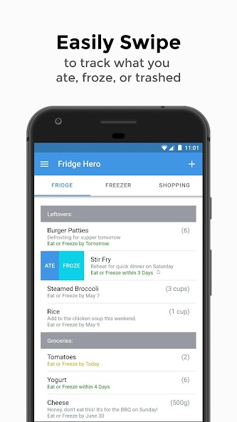 • Swipe left or right to easily track what has been eaten, frozen, or trashed.