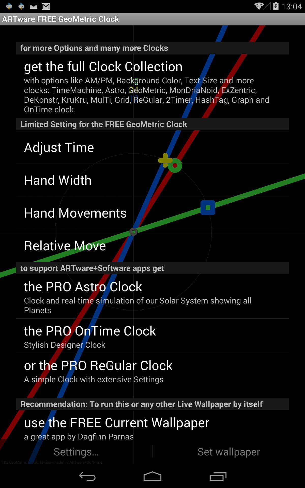 For more settings like AM/PM time-format, background color, (widget like) screen placement and more options one can upgrade to the ARTware Clock Collection that also includes many more clocks, like the Astro, GeoMetric, MonDriaNoid, ExZentric, DeKonstr, KruKru, MulTi, Grid, ReGular, 2Timer, Time Machine, HashTag, Graph and OnTime clock.