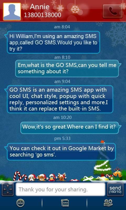 Merry Christmas Theme for GO SMS Pro is available now! Designed and developed by GO SMS Dev Team.This is a theme for Christmas,going well with the new interface of the latest