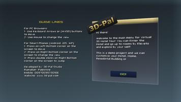 You can make 3D virtual tour in Palestine Hotel, use virtual buttons in the bottom of the screen to navigate the view in the hotel, you can walk through the hotel, open doors, moving elevator, enter rooms, etc...