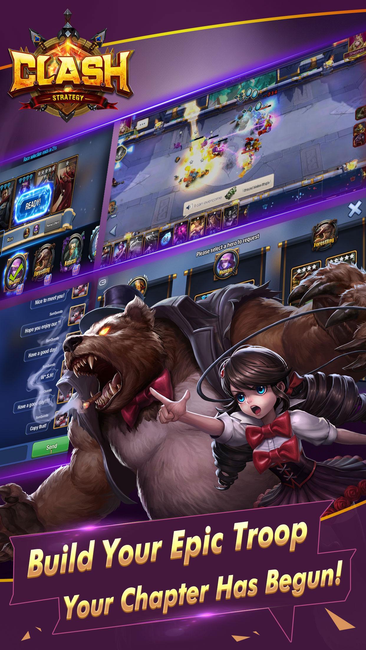 Clash adalah game mobile RTS. Anda dapat memilih dua balapan dari empat belas balapan yang dirancang unik dan menggunakan hingga delapan pahlawan untuk bersaing dengan lawan Anda dalam mode 1V1 dan 2V2.