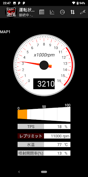 Aplikasi ini dapat diunduh secara gratis. Ketika gratis, Anda dapat terhubung dengan semua enigma semi-penuh, tetapi hanya layar tachometer yang ditampilkan. (Hanya tachometer dan TPS yang ditampilkan).