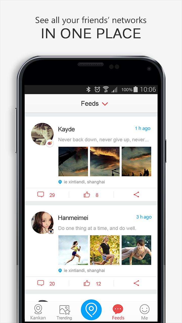 Kankan melakukan lebih dari sekadar membuat Anda tetap berhubungan; Ini membantu Anda terhubung ke dunia Anda. Ini adalah aplikasi pertama di dunia dari jenisnya, satu platform yang mengkonsolidasikan, mengelola, dan meningkatkan semua akun media sosial Anda (termasuk Instagram, Weibo, QQ dan banyak lagi) untuk tidak hanya membantu Anda tetap di atas apa yang penting, tetapi untuk membantu Anda memanfaatkan sebagian besar di mana Anda berada sekarang. Umpan khusus kami bekerja terus -menerus untuk menghubungkan Anda dengan konten, berita, acara, teman, dan bahkan orang asing yang paling penting, di mana pun Anda berada atau ke mana Anda pergi.