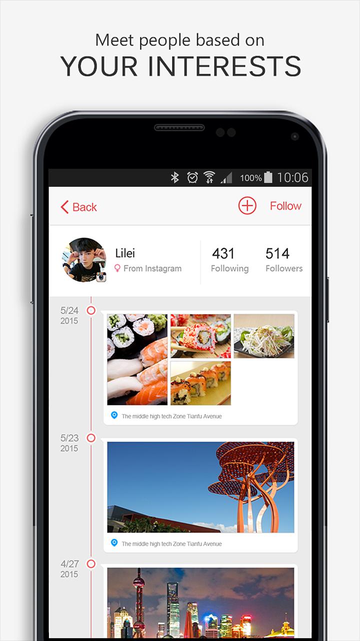 Tetap terhubung dengan teman, dan temukan yang baru yang memiliki minat yang sama (makanan, musik, mode ...), ke mana pun Anda pergi. Anda akan tahu di mana teman -teman Anda dan apa yang mereka lakukan, sehingga Anda dapat bergabung dalam kesenangan.