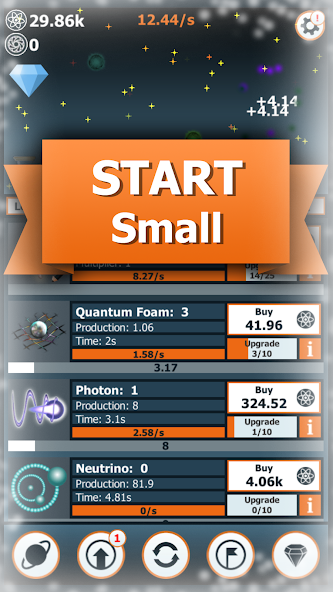 • Get even bigger with prestige! Every time you restart the game, you will obtain Antimatter, which can be used to buy permanent super powers!